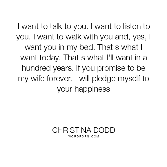 I want to talk to you. I want to listen to you. I want to walk with you and, yes, I want you in my bed. That's what I want today. That's what I'll want in a hundred years. If you promise to be my wife forever, I will pledge myself to your happiness