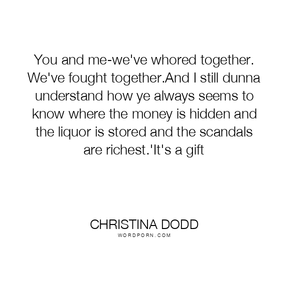 You and me-we've whored together. We've fought together.And I still dunna understand how ye always seems to know where the money is hidden and the liquor is stored and the scandals are richest.'It's a gift