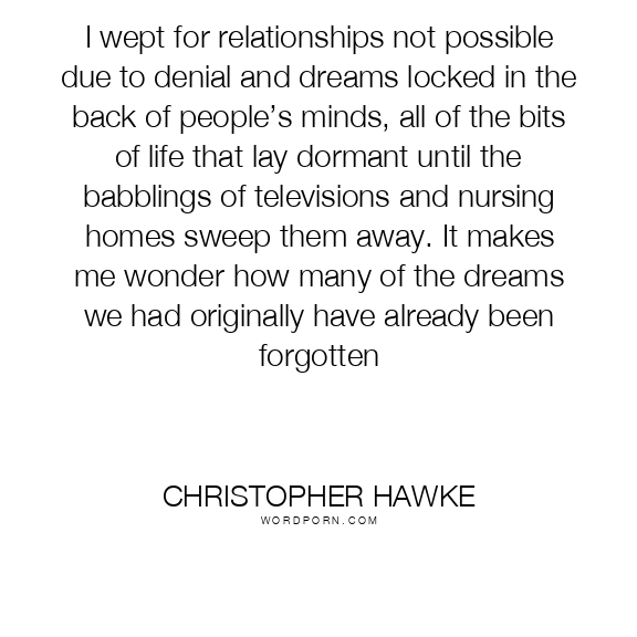 I wept for relationships not possible due to denial and dreams locked in the back of people’s minds, all of the bits of life that lay dormant until the babblings of televisions and nursing homes sweep them away. It makes me wonder how many of the dreams we had originally have already been forgotten