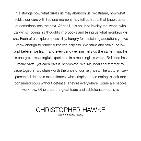 It’s strange how what drives us may abandon us midstream, how what tickles our ears with lies one moment may tell us truths that knock us on our emotional ass the next. After all, it is an unbelievably real world, with Darwin scribbling his thoughts into books and telling us what monkeys we are. Each of us explores possibility, hungry for sustaining adoration, yet we know enough to render ourselves helpless. We strive and strain, bellow and believe, we learn, and everything we learn tells us the same thing: life is one great meaningful experience in a meaningless world. Brilliance has many parts, yet each part is incomplete. We live, heal and attempt to piece together a picture worth the price of our very lives. The picture I saw presented demonic executioners, who crippled those daring to look and consumed souls without defense. They’re everywhere. Some are people we know. Others are the great fears and addictions of our lives