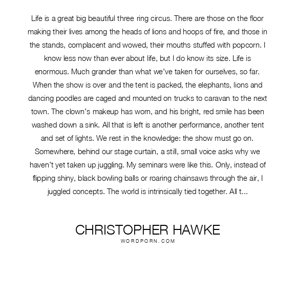 Life is a great big beautiful three-ring circus. There are those on the floor making their lives among the heads of lions and hoops of fire, and those in the stands, complacent and wowed, their mouths stuffed with popcorn. I know less now than ever about life, but I do know its size. Life is enormous. Much grander than what we’ve taken for ourselves, so far. When the show is over and the tent is packed, the elephants, lions and dancing poodles are caged and mounted on trucks to caravan to the next town. The clown’s makeup has worn, and his bright, red smile has been washed down a sink. All that is left is another performance, another tent and set of lights. We rest in the knowledge: the show must go on. Somewhere, behind our stage curtain, a still, small voice asks why we haven’t yet taken up juggling. My seminars were like this. Only, instead of flipping shiny, black bowling balls or roaring chainsaws through the air, I juggled concepts. The world is intrinsically tied together. All things march through time at different intervals but move ahead in one fashion or another. Though we may never understand it, we are all part of something much larger than ourselves—something anchoring us to the spot we have mentally chosen. We sniff out the rules, through spiritual quests and the sciences. And with every new discovery, we grow more confused. Our inability to connect what seems illogical to unite and to defy logic in our understanding keeps us from enlightenment. The artists and insane tiptoe around such insights, but lack the compassion to hand-feed these concepts to a blind world. The interconnectedness of all things is not simply a pet phrase. It is a big “T