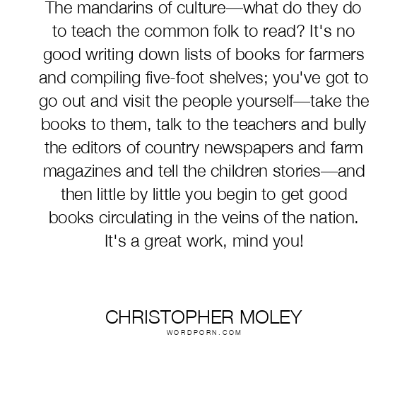 The mandarins of culture—what do they do to teach the common folk to read? It's no good writing down lists of books for farmers and compiling five-foot shelves; you've got to go out and visit the people yourself—take the books to them, talk to the teachers and bully the editors of country newspapers and farm magazines and tell the children stories—and then little by little you begin to get good books circulating in the veins of the nation. It's a great work, mind you!