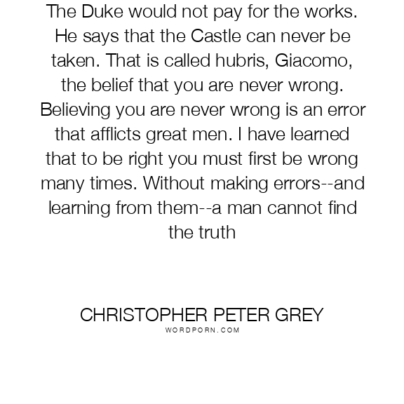 The Duke would not pay for the works. He says that the Castle can never be taken. That is called hubris, Giacomo, the belief that you are never wrong. Believing you are never wrong is an error that afflicts great men. I have learned that to be right you must first be wrong many times. Without making errors--and learning from them--a man cannot find the truth