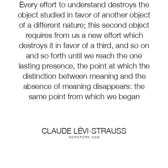 Every effort to understand destroys the object studied in favor of another object of a different nature; this second object requires from us a new effort which destroys it in favor of a third, and so on and so forth until we reach the one lasting presence, the point at which the distinction between meaning and the absence of meaning disappears: the same point from which we began
