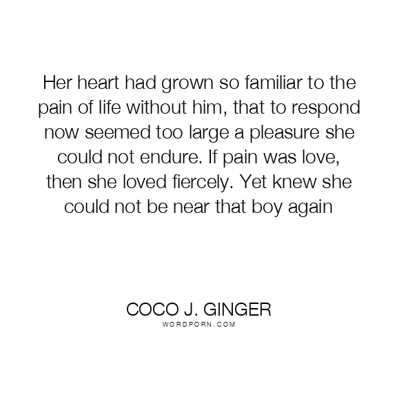 Her heart had grown so familiar to the pain of life without him, that to respond now seemed too large a pleasure she could not endure. If pain was love, then she loved fiercely. Yet knew she could not be near that boy again