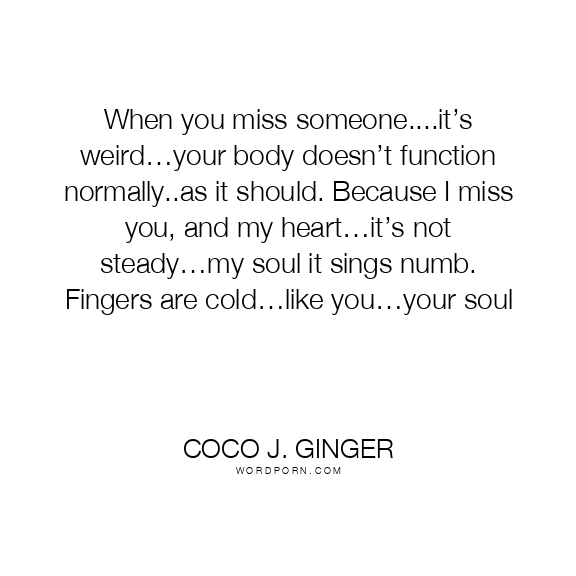 When you miss someone....it’s weird…your body doesn’t function normally..as it should. Because I miss you, and my heart…it’s not steady…my soul it sings numb. Fingers are cold…like you…your soul