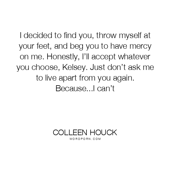 I decided to find you, throw myself at your feet, and beg you to have mercy on me. Honestly, I’ll accept whatever you choose, Kelsey. Just don’t ask me to live apart from you again. Because...I can’t