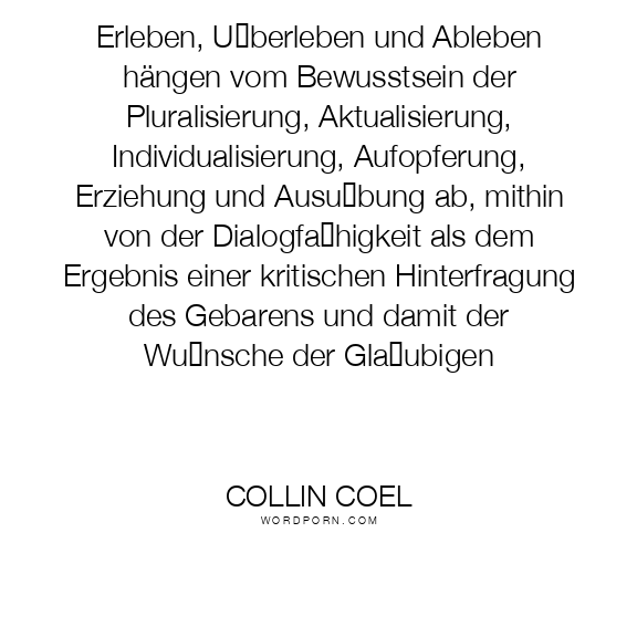 Erleben, Überleben und Ableben hängen vom Bewusstsein der Pluralisierung, Aktualisierung, Individualisierung, Aufopferung, Erziehung und Ausübung ab, mithin von der Dialogfähigkeit als dem Ergebnis einer kritischen Hinterfragung des Gebarens und damit der Wünsche der Gläubigen