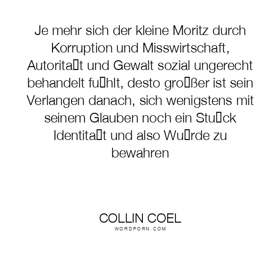 Je mehr sich der kleine Moritz durch Korruption und Misswirtschaft, Autorität und Gewalt sozial ungerecht behandelt fühlt, desto größer ist sein Verlangen danach, sich wenigstens mit seinem Glauben noch ein Stück Identität und also Würde zu bewahren