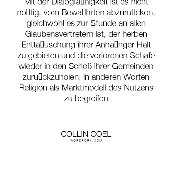 Mit der Dialogfähigkeit ist es nicht nötig, vom Bewährten abzurücken, gleichwohl es zur Stunde an allen Glaubensvertretern ist, der herben Enttäuschung ihrer Anhänger Halt zu gebieten und die verlorenen Schafe wieder in den Schoß ihrer Gemeinden zurückzuholen, in anderen Worten Religion als Marktmodell des Nutzens zu begreifen