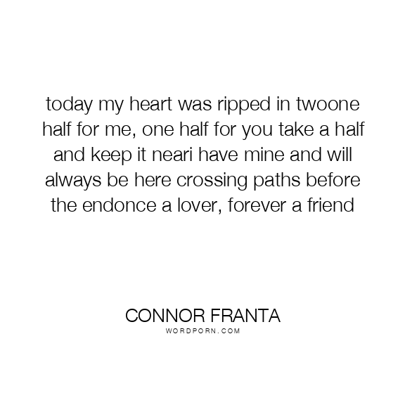 today my heart was ripped in twoone half for me, one half for you take a half and keep it neari have mine and will always be here crossing paths before the endonce a lover, forever a friend
