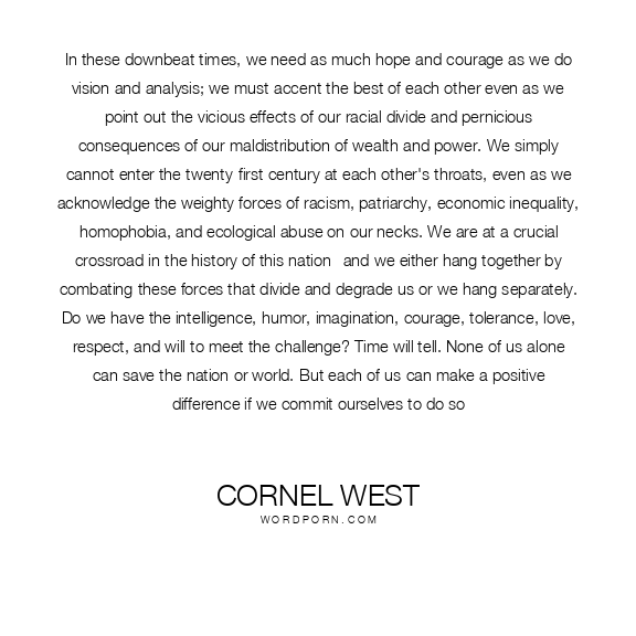 In these downbeat times, we need as much hope and courage as we do vision and analysis; we must accent the best of each other even as we point out the vicious effects of our racial divide and pernicious consequences of our maldistribution of wealth and power. We simply cannot enter the twenty-first century at each other's throats, even as we acknowledge the weighty forces of racism, patriarchy, economic inequality, homophobia, and ecological abuse on our necks. We are at a crucial crossroad in the history of this nation--and we either hang together by combating these forces that divide and degrade us or we hang separately. Do we have the intelligence, humor, imagination, courage, tolerance, love, respect, and will to meet the challenge? Time will tell. None of us alone can save the nation or world. But each of us can make a positive difference if we commit ourselves to do so
