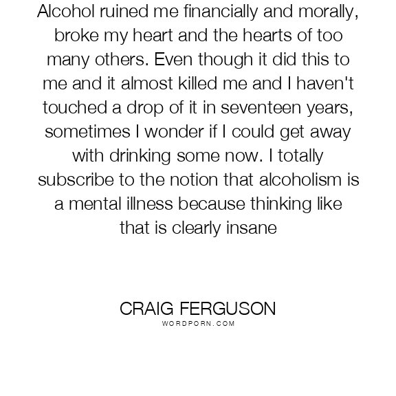 Alcohol ruined me financially and morally, broke my heart and the hearts of too many others. Even though it did this to me and it almost killed me and I haven't touched a drop of it in seventeen years, sometimes I wonder if I could get away with drinking some now. I totally subscribe to the notion that alcoholism is a mental illness because thinking like that is clearly insane