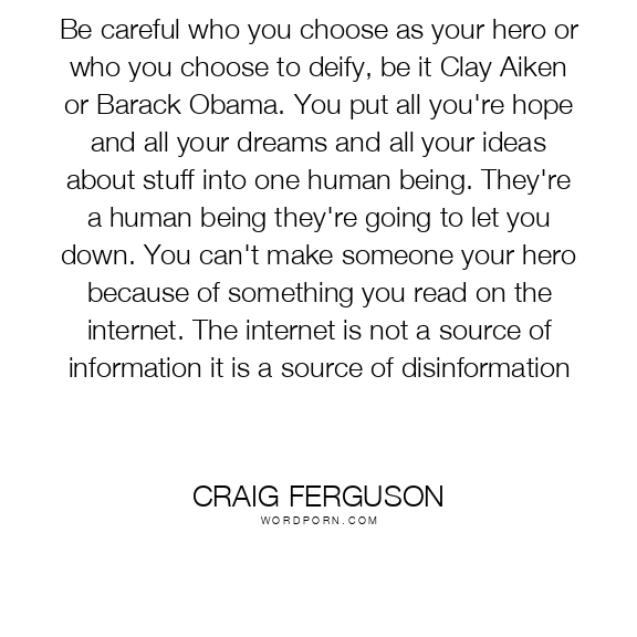 Be careful who you choose as your hero or who you choose to deify, be it Clay Aiken or Barack Obama. You put all you're hope and all your dreams and all your ideas about stuff into one human being. They're a human being they're going to let you down. You can't make someone your hero because of something you read on the internet. The internet is not a source of information it is a source of disinformation