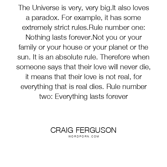 The Universe is very, very big.It also loves a paradox. For example, it has some extremely strict rules.Rule number one: Nothing lasts forever.Not you or your family or your house or your planet or the sun. It is an absolute rule. Therefore when someone says that their love will never die, it means that their love is not real, for everything that is real dies. Rule number two: Everything lasts forever
