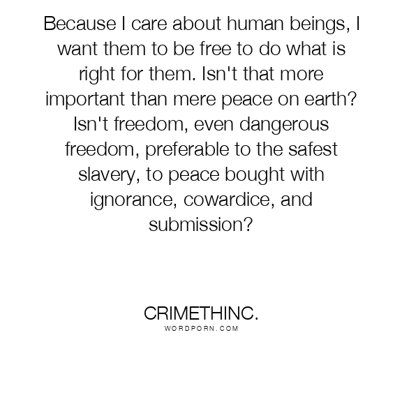 Because I care about human beings, I want them to be free to do what is right for them. Isn't that more important than mere peace on earth? Isn't freedom, even dangerous freedom, preferable to the safest slavery, to peace bought with ignorance, cowardice, and submission?