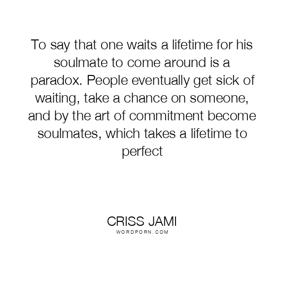 To say that one waits a lifetime for his soulmate to come around is a paradox. People eventually get sick of waiting, take a chance on someone, and by the art of commitment become soulmates, which takes a lifetime to perfect