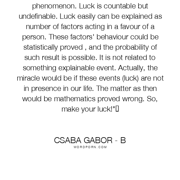 Luck is not some esoteric, godlike phenomenon. Luck is countable but undefinable. Luck easily can be explained as number of factors acting in a favour of a person. These factors' behaviour could be statistically proved , and the probability of such result is possible. It is not related to something explainable event. Actually, the miracle would be if these events (luck) are not in presence in our life. The matter as then would be mathematics proved wrong. So, make your luck!"