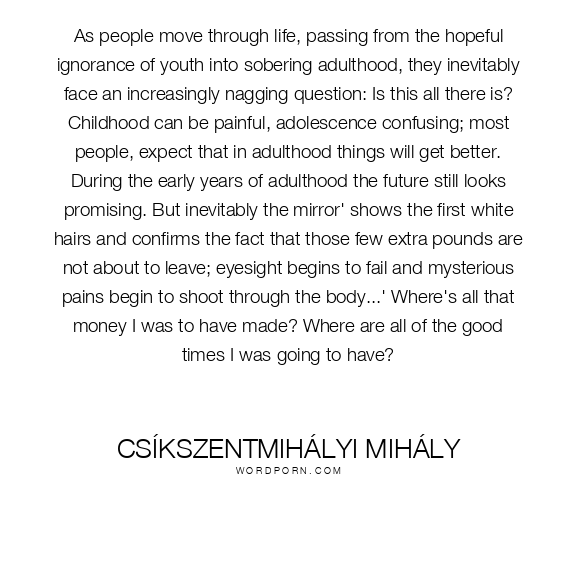 As people move through life, passing from the hopeful ignorance of youth into sobering adulthood, they inevitably face an increasingly nagging question: Is this all there is? Childhood can be painful, adolescence confusing; most people, expect that in adulthood things will get better. During the early years of adulthood the future still looks promising. But inevitably the mirror' shows the first white hairs and confirms the fact that those few extra pounds are not about to leave; eyesight begins to fail and mysterious pains begin to shoot through the body...' Where's all that money I was to have made? Where are all of the good times I was going to have?