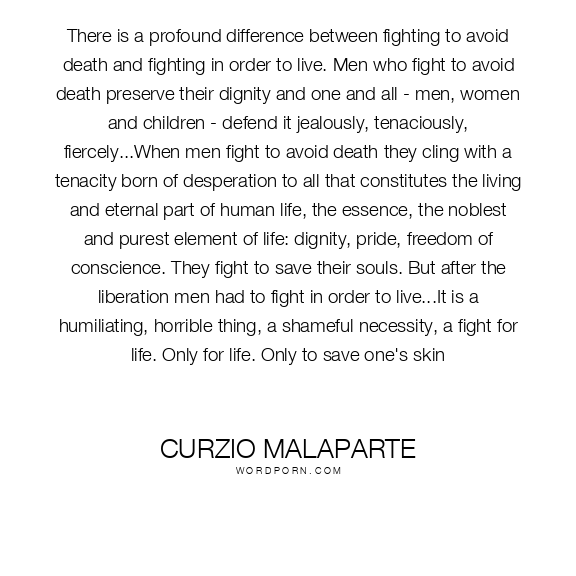 There is a profound difference between fighting to avoid death and fighting in order to live. Men who fight to avoid death preserve their dignity and one and all - men, women and children - defend it jealously, tenaciously, fiercely...When men fight to avoid death they cling with a tenacity born of desperation to all that constitutes the living and eternal part of human life, the essence, the noblest and purest element of life: dignity, pride, freedom of conscience. They fight to save their souls. But after the liberation men had to fight in order to live...It is a humiliating, horrible thing, a shameful necessity, a fight for life. Only for life. Only to save one's skin