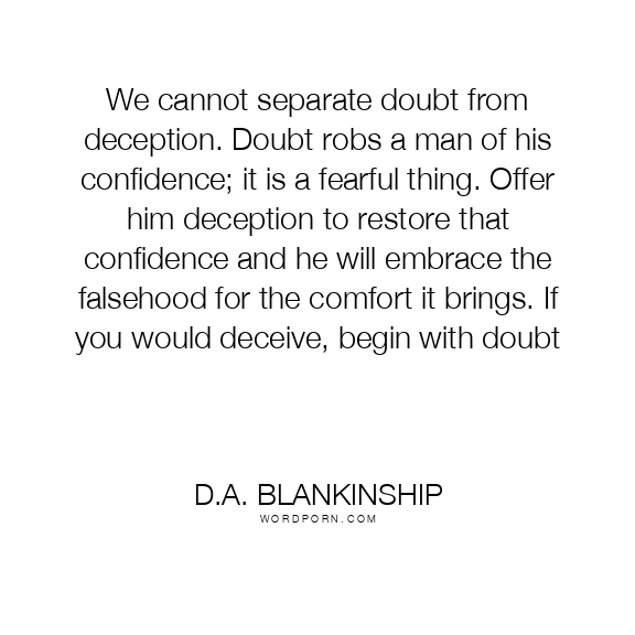 We cannot separate doubt from deception. Doubt robs a man of his confidence; it is a fearful thing. Offer him deception to restore that confidence and he will embrace the falsehood for the comfort it brings. If you would deceive, begin with doubt