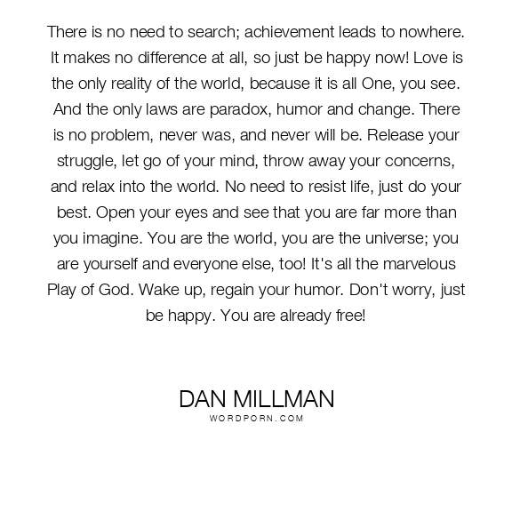There is no need to search; achievement leads to nowhere. It makes no difference at all, so just be happy now! Love is the only reality of the world, because it is all One, you see. And the only laws are paradox, humor and change. There is no problem, never was, and never will be. Release your struggle, let go of your mind, throw away your concerns, and relax into the world. No need to resist life, just do your best. Open your eyes and see that you are far more than you imagine. You are the world, you are the universe; you are yourself and everyone else, too! It's all the marvelous Play of God. Wake up, regain your humor. Don't worry, just be happy. You are already free!
