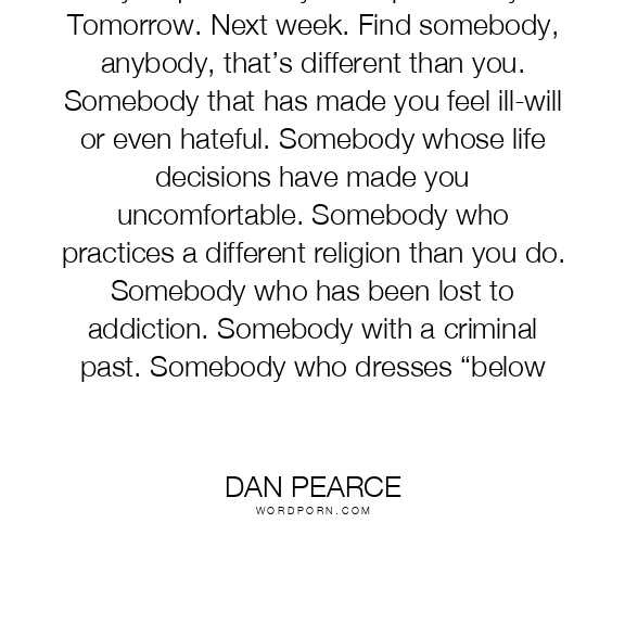 My request today is simple. Today. Tomorrow. Next week. Find somebody, anybody, that’s different than you. Somebody that has made you feel ill-will or even hateful. Somebody whose life decisions have made you uncomfortable. Somebody who practices a different religion than you do. Somebody who has been lost to addiction. Somebody with a criminal past. Somebody who dresses “below