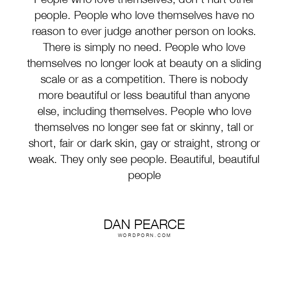 People who love themselves, don’t hurt other people. People who love themselves have no reason to ever judge another person on looks. There is simply no need. People who love themselves no longer look at beauty on a sliding scale or as a competition. There is nobody more beautiful or less beautiful than anyone else, including themselves. People who love themselves no longer see fat or skinny, tall or short, fair or dark skin, gay or straight, strong or weak. They only see people. Beautiful, beautiful people