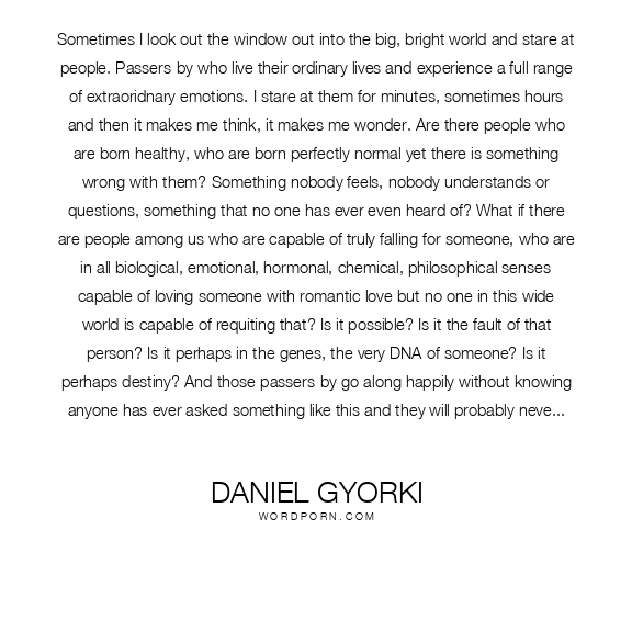Sometimes I look out the window out into the big, bright world and stare at people. Passers-by who live their ordinary lives and experience a full range of extraoridnary emotions. I stare at them for minutes, sometimes hours and then it makes me think, it makes me wonder. Are there people who are born healthy, who are born perfectly normal yet there is something wrong with them? Something nobody feels, nobody understands or questions, something that no one has ever even heard of? What if there are people among us who are capable of truly falling for someone, who are - in all biological, emotional, hormonal, chemical, philosophical senses - capable of loving someone with romantic love but no one in this wide world is capable of requiting that? Is it possible? Is it the fault of that person? Is it perhaps in the genes, the very DNA of someone? Is it perhaps destiny? And those passers-by go along happily without knowing anyone has ever asked something like this and they will probably never think about anything such because there might be only one person in this world who has to experience the feeling, the feeling that is so deeply rooted in a life alone