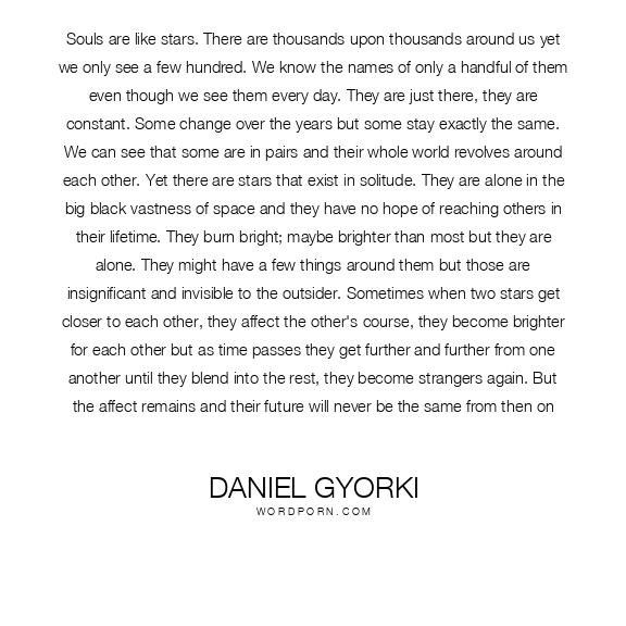Souls are like stars. There are thousands upon thousands around us yet we only see a few hundred. We know the names of only a handful of them even though we see them every day. They are just there, they are constant. Some change over the years but some stay exactly the same. We can see that some are in pairs and their whole world revolves around each other. Yet there are stars that exist in solitude. They are alone in the big black vastness of space and they have no hope of reaching others in their lifetime. They burn bright; maybe brighter than most but they are alone. They might have a few things around them but those are insignificant and invisible to the outsider. Sometimes when two stars get closer to each other, they affect the other's course, they become brighter for each other but as time passes they get further and further from one another until they blend into the rest, they become strangers again. But the affect remains and their future will never be the same from then on