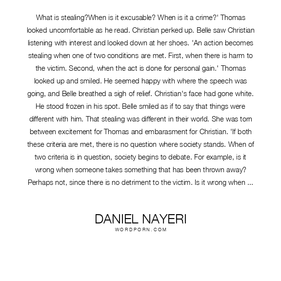 What is stealing?When is it excusable? When is it a crime?' Thomas looked uncomfortable as he read. Christian perked up. Belle saw Christian listening with interest and looked down at her shoes. 'An action becomes stealing when one of two conditions are met. First, when there is harm to the victim. Second, when the act is done for personal gain.' Thomas looked up and smiled. He seemed happy with where the speech was going, and Belle breathed a sigh of relief. Christian's face had gone white. He stood frozen in his spot. Belle smiled as if to say that things were different with him. That stealing was different in their world. She was torn between excitement for Thomas and embarasment for Christian. 'If both these criteria are met, there is no question where society stands. When of two criteria is in question, society begins to debate. For example, is it wrong when someone takes something that has been thrown away? Perhaps not, since there is no detriment to the victim. Is it wrong when someone takes a loaf of bread to feed a starving baby or taxes the rich to help the poor? Perhaps not, since the motive is unselfish.' Victoria wasn't even looking at Thomas anymore. She was glaring at Belle. She looked like she was about to lunge at her. Belle signaled to her that perhaps she should take notes. But Victoria wasn't used to preparing rebuttals without advanced notice.'When neither of the criteria is met, however, I propose that there is no crime against ethics. Is it wrong to take a syringe from a drug addict? Of course not