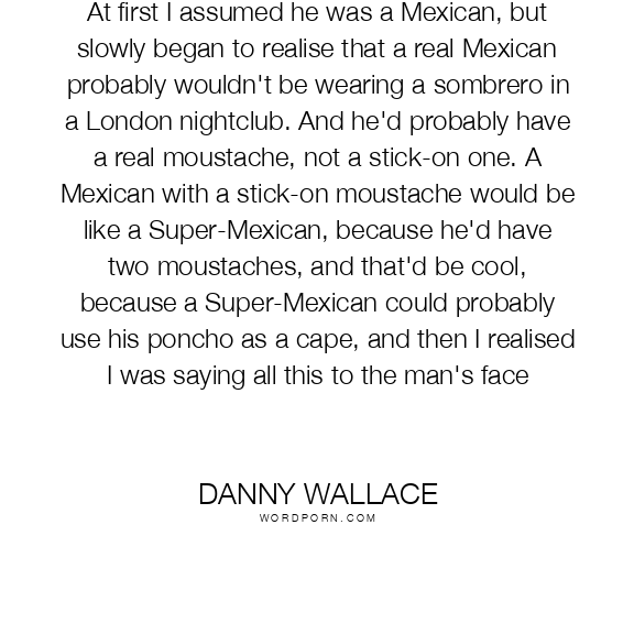 At first I assumed he was a Mexican, but slowly began to realise that a real Mexican probably wouldn't be wearing a sombrero in a London nightclub. And he'd probably have a real moustache, not a stick-on one. A Mexican with a stick-on moustache would be like a Super-Mexican, because he'd have two moustaches, and that'd be cool, because a Super-Mexican could probably use his poncho as a cape, and then I realised I was saying all this to the man's face