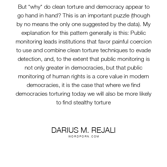 But *why* do clean torture and democracy appear to go hand in hand? This is an important puzzle (though by no means the only one suggested by the data). My explanation for this pattern generally is this: Public monitoring leads institutions that favor painful coercion to use and combine clean torture techniques to evade detection, and, to the extent that public monitoring is not only greater in democracies, but that public monitoring of human rights is a core value in modern democracies, it is the case that where we find democracies torturing today we will also be more likely to find stealthy torture