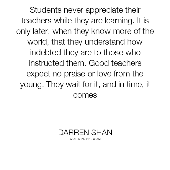 Students never appreciate their teachers while they are learning. It is only later, when they know more of the world, that they understand how indebted they are to those who instructed them. Good teachers expect no praise or love from the young. They wait for it, and in time, it comes