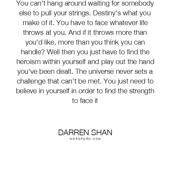 You can't hang around waiting for somebody else to pull your strings. Destiny's what you make of it. You have to face whatever life throws at you. And if it throws more than you'd like, more than you think you can handle? Well then you just have to find the heroism within yourself and play out the hand you've been dealt. The universe never sets a challenge that can't be met. You just need to believe in yourself in order to find the strength to face it