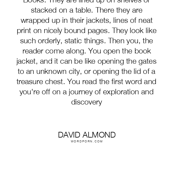 Books. They are lined up on shelves or stacked on a table. There they are wrapped up in their jackets, lines of neat print on nicely bound pages. They look like such orderly, static things. Then you, the reader come along. You open the book jacket, and it can be like opening the gates to an unknown city, or opening the lid of a treasure chest. You read the first word and you're off on a journey of exploration and discovery
