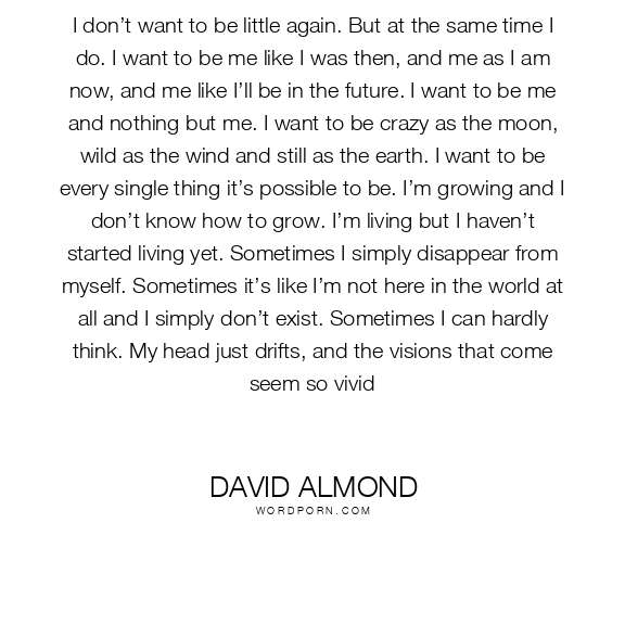 I don’t want to be little again. But at the same time I do. I want to be me like I was then, and me as I am now, and me like I’ll be in the future. I want to be me and nothing but me. I want to be crazy as the moon, wild as the wind and still as the earth. I want to be every single thing it’s possible to be. I’m growing and I don’t know how to grow. I’m living but I haven’t started living yet. Sometimes I simply disappear from myself. Sometimes it’s like I’m not here in the world at all and I simply don’t exist. Sometimes I can hardly think. My head just drifts, and the visions that come seem so vivid