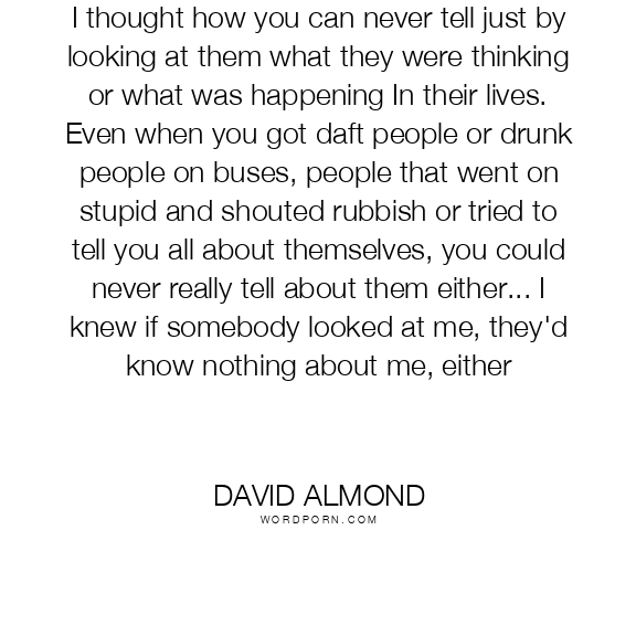 I thought how you can never tell just by looking at them what they were thinking or what was happening In their lives. Even when you got daft people or drunk people on buses, people that went on stupid and shouted rubbish or tried to tell you all about themselves, you could never really tell about them either... I knew if somebody looked at me, they'd know nothing about me, either