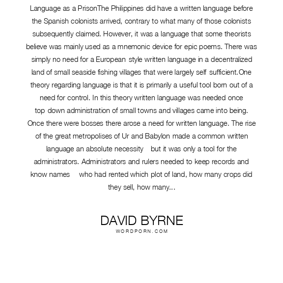 Language as a PrisonThe Philippines did have a written language before the Spanish colonists arrived, contrary to what many of those colonists subsequently claimed. However, it was a language that some theorists believe was mainly used as a mnemonic device for epic poems. There was simply no need for a European-style written language in a decentralized land of small seaside fishing villages that were largely self-sufficient.One theory regarding language is that it is primarily a useful tool born out of a need for control. In this theory written language was needed once top-down administration of small towns and villages came into being. Once there were bosses there arose a need for written language. The rise of the great metropolises of Ur and Babylon made a common written language an absolute necessity—but it was only a tool for the administrators. Administrators and rulers needed to keep records and know names— who had rented which plot of land, how many crops did they sell, how many fish did they catch, how many children do they have, how many water buffalo? More important, how much then do they owe me? In this account of the rise of written language, naming and accounting seem to be language's primary "civilizing" function. Language and number are also handy for keeping track of the movement of heavenly bodies, crop yields, and flood cycles. Naturally, a version of local oral languages was eventually translated into symbols as well, and nonadministrative words, the words of epic oral poets, sort of went along for the ride, according to this version.What's amazing to me is that if we accept this idea, then what may have begun as an instrument of social and economic control has now been internalized by us as a mark of being civilized. As if being controlled were, by inference, seen as a good thing, and to proudly wear the badge of this agent of control—to be able to read and write—makes us better, superior, more advanced. We have turned an object of our own oppression into something we now think of as virtuous. Perfect! We accept written language as something so essential to how we live and get along in the world that we feel and recognize its presence as an exclusively positive thing, a sign of enlightenment. We've come to love the chains that bind us, that control us, for we believe that they are us (161-2)