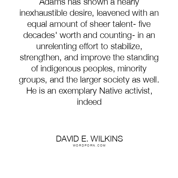 Adams has shown a nearly inexhaustible desire, leavened with an equal amount of sheer talent- five decades' worth and counting- in an unrelenting effort to stabilize, strengthen, and improve the standing of indigenous peoples, minority groups, and the larger society as well. He is an exemplary Native activist, indeed