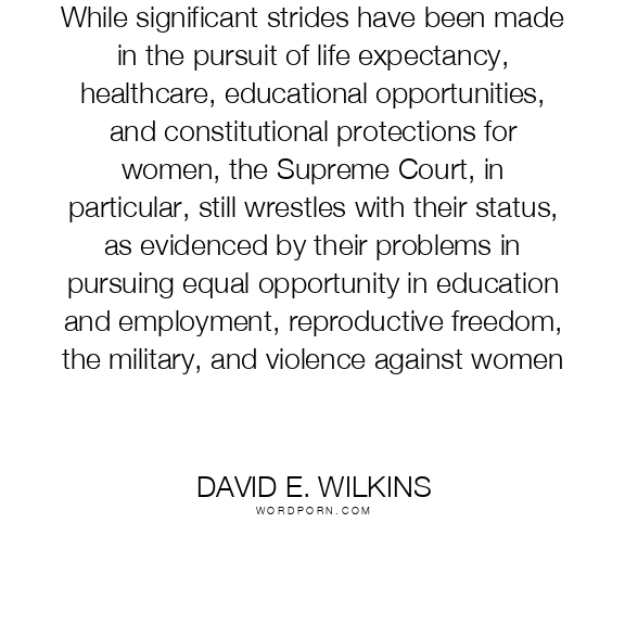 While significant strides have been made in the pursuit of life expectancy, healthcare, educational opportunities, and constitutional protections for women, the Supreme Court, in particular, still wrestles with their status, as evidenced by their problems in pursuing equal opportunity in education and employment, reproductive freedom, the military, and violence against women