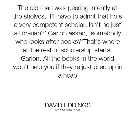 The old man was peering intently at the shelves. 'I'll have to admit that he's a very competent scholar.'Isn't he just a librarian?' Garion asked, 'somebody who looks after books?'That's where all the rest of scholarship starts, Garion. All the books in the world won't help you if they're just piled up in a heap