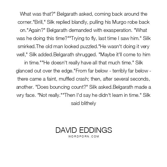 What was that?" Belgarath asked, coming back around the corner."Brill," Silk replied blandly, pulling his Murgo robe back on."Again?" Belgarath demanded with exasperation. "What was he doing this time?""Trying to fly, last time I saw him." Silk smirked.The old man looked puzzled."He wasn't doing it very well," Silk added.Belgarath shrugged. "Maybe it'll come to him in time.""He doesn't really have all that much time." Silk glanced out over the edge."From far below - terribly far below - there came a faint, muffled crash; then, after several seconds, another. "Does bouncing count?" Silk asked.Belgarath made a wry face. "Not really.""Then I'd say he didn't learn in time." Silk said blithely