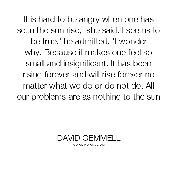 It is hard to be angry when one has seen the sun rise,' she said.It seems to be true,' he admitted. 'I wonder why.'Because it makes one feel so small and insignificant. It has been rising forever and will rise forever no matter what we do or do not do. All our problems are as nothing to the sun