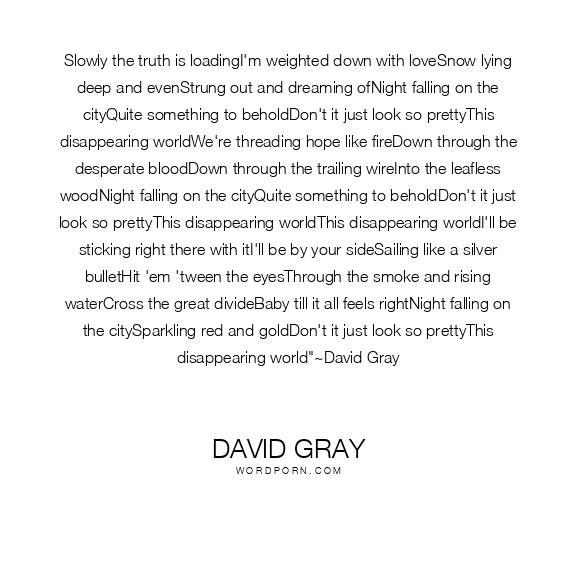 Slowly the truth is loadingI'm weighted down with loveSnow lying deep and evenStrung out and dreaming ofNight falling on the cityQuite something to beholdDon't it just look so prettyThis disappearing worldWe're threading hope like fireDown through the desperate bloodDown through the trailing wireInto the leafless woodNight falling on the cityQuite something to beholdDon't it just look so prettyThis disappearing worldThis disappearing worldI'll be sticking right there with itI'll be by your sideSailing like a silver bulletHit 'em 'tween the eyesThrough the smoke and rising waterCross the great divideBaby till it all feels rightNight falling on the citySparkling red and goldDon't it just look so prettyThis disappearing world"~David Gray