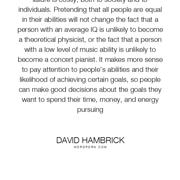 failure is costly, both to society and to individuals. Pretending that all people are equal in their abilities will not change the fact that a person with an average IQ is unlikely to become a theoretical physicist, or the fact that a person with a low level of music ability is unlikely to become a concert pianist. It makes more sense to pay attention to people’s abilities and their likelihood of achieving certain goals, so people can make good decisions about the goals they want to spend their time, money, and energy pursuing