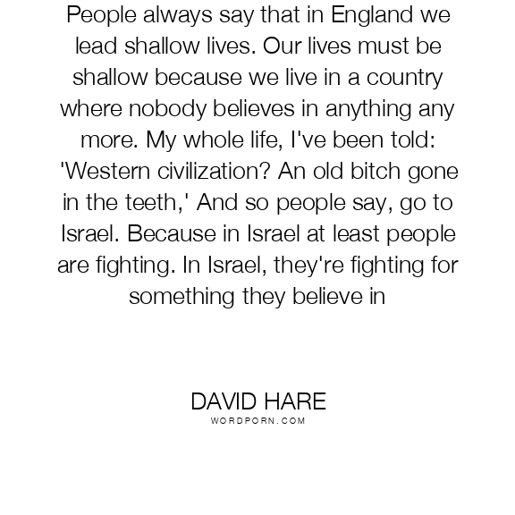 People always say that in England we lead shallow lives. Our lives must be shallow because we live in a country where nobody believes in anything any more. My whole life, I've been told: 'Western civilization? An old bitch gone in the teeth,' And so people say, go to Israel. Because in Israel at least people are fighting. In Israel, they're fighting for something they believe in
