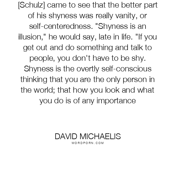 [Schulz] came to see that the better part of his shyness was really vanity, or self-centeredness. "Shyness is an illusion," he would say, late in life. "If you get out and do something and talk to people, you don't have to be shy. Shyness is the overtly self-conscious thinking that you are the only person in the world; that how you look and what you do is of any importance
