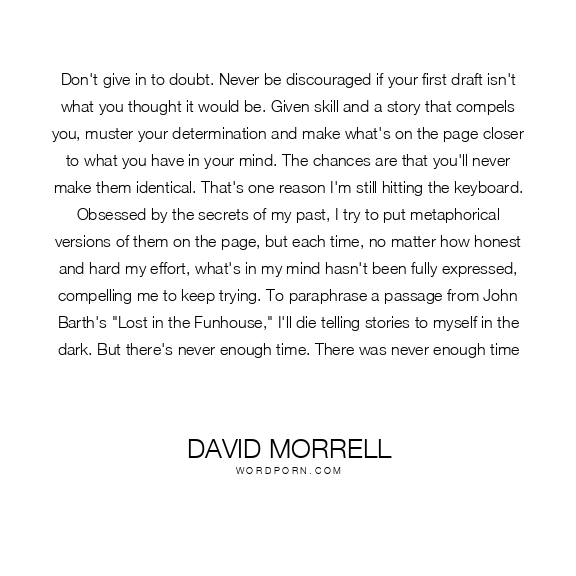 Don't give in to doubt. Never be discouraged if your first draft isn't what you thought it would be. Given skill and a story that compels you, muster your determination and make what's on the page closer to what you have in your mind. The chances are that you'll never make them identical. That's one reason I'm still hitting the keyboard. Obsessed by the secrets of my past, I try to put metaphorical versions of them on the page, but each time, no matter how honest and hard my effort, what's in my mind hasn't been fully expressed, compelling me to keep trying. To paraphrase a passage from John Barth's "Lost in the Funhouse," I'll die telling stories to myself in the dark. But there's never enough time. There was never enough time