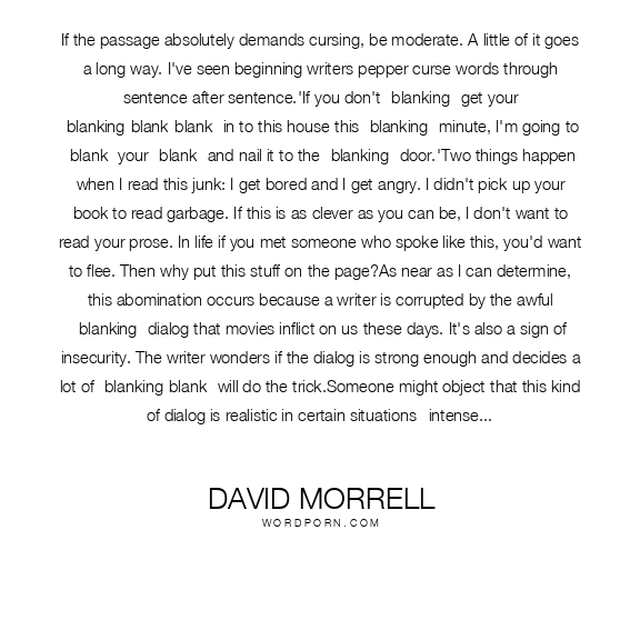 If the passage absolutely demands cursing, be moderate. A little of it goes a long way. I've seen beginning writers pepper curse words through sentence after sentence.'If you don't -blanking- get your -blanking-blank-blank- in to this house this -blanking- minute, I'm going to -blank- your -blank- and nail it to the -blanking- door.'Two things happen when I read this junk: I get bored and I get angry. I didn't pick up your book to read garbage. If this is as clever as you can be, I don't want to read your prose. In life if you met someone who spoke like this, you'd want to flee. Then why put this stuff on the page?As near as I can determine, this abomination occurs because a writer is corrupted by the awful -blanking- dialog that movies inflict on us these days. It's also a sign of insecurity. The writer wonders if the dialog is strong enough and decides a lot of -blanking-blank- will do the trick.Someone might object that this kind of dialog is realistic in certain situations--intense scenes involving policemen or soldiers for example. I can only reply that in my research I spend considerable time with policemen and soldiers. Few of them curse any more than a normal person would. This garbage isn't realistic. It merely draws attention to itself and holds back the story. Use it sparingly